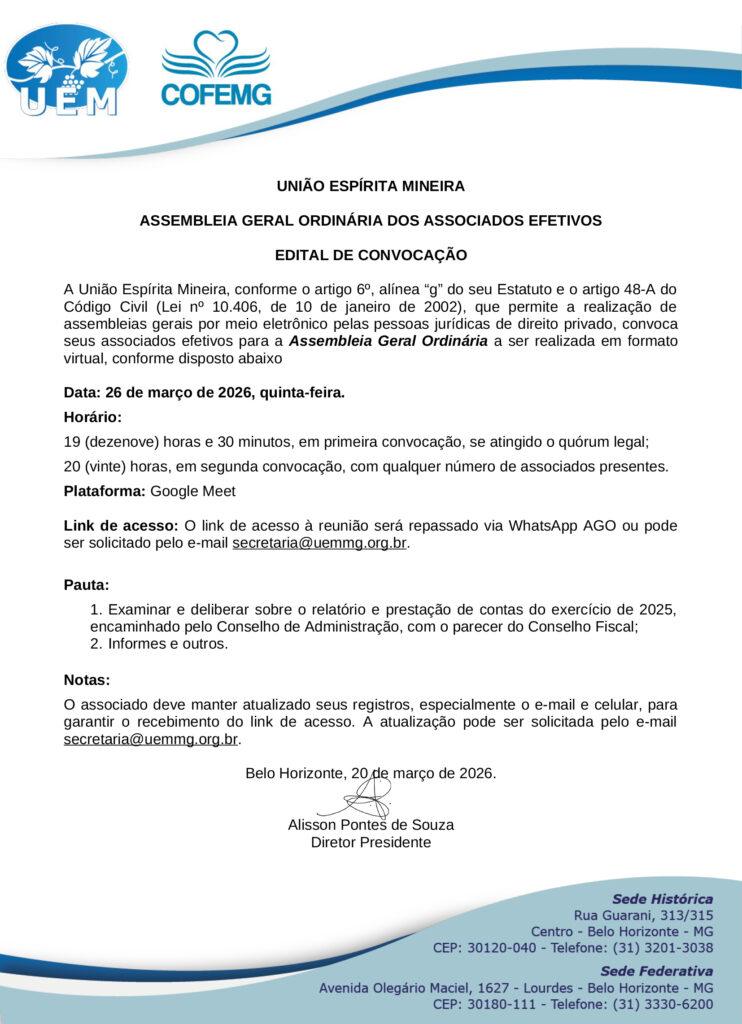 Código Civil (Lei nº 10.406, de 10 de janeiro de 2002), convoca seus associados efetivos para a Assembleia Geral Ordinária a ser realizada em formato virtual, o dia 26/03/2026, conforme disposto abaixo: